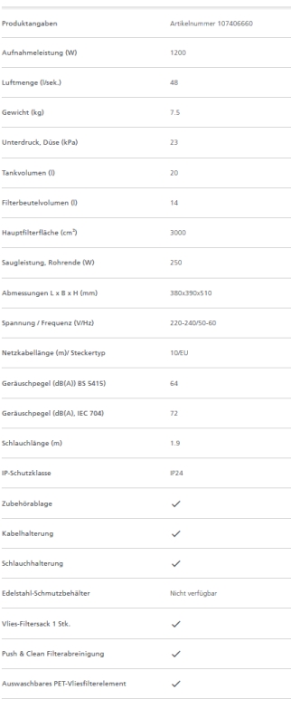 Lieferumfang: 240 Volt Staubsauger, inkl. Schlauch, Teleskoprohr Stahl, Hartbodendüse, Nassbodendüse, Fugendüse, Rundbürste, Filterelement, 20 l Fassungsvolumen